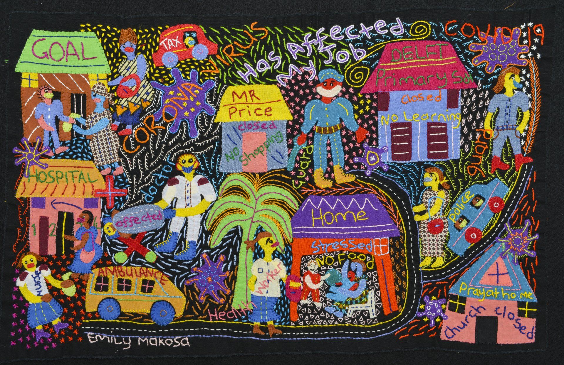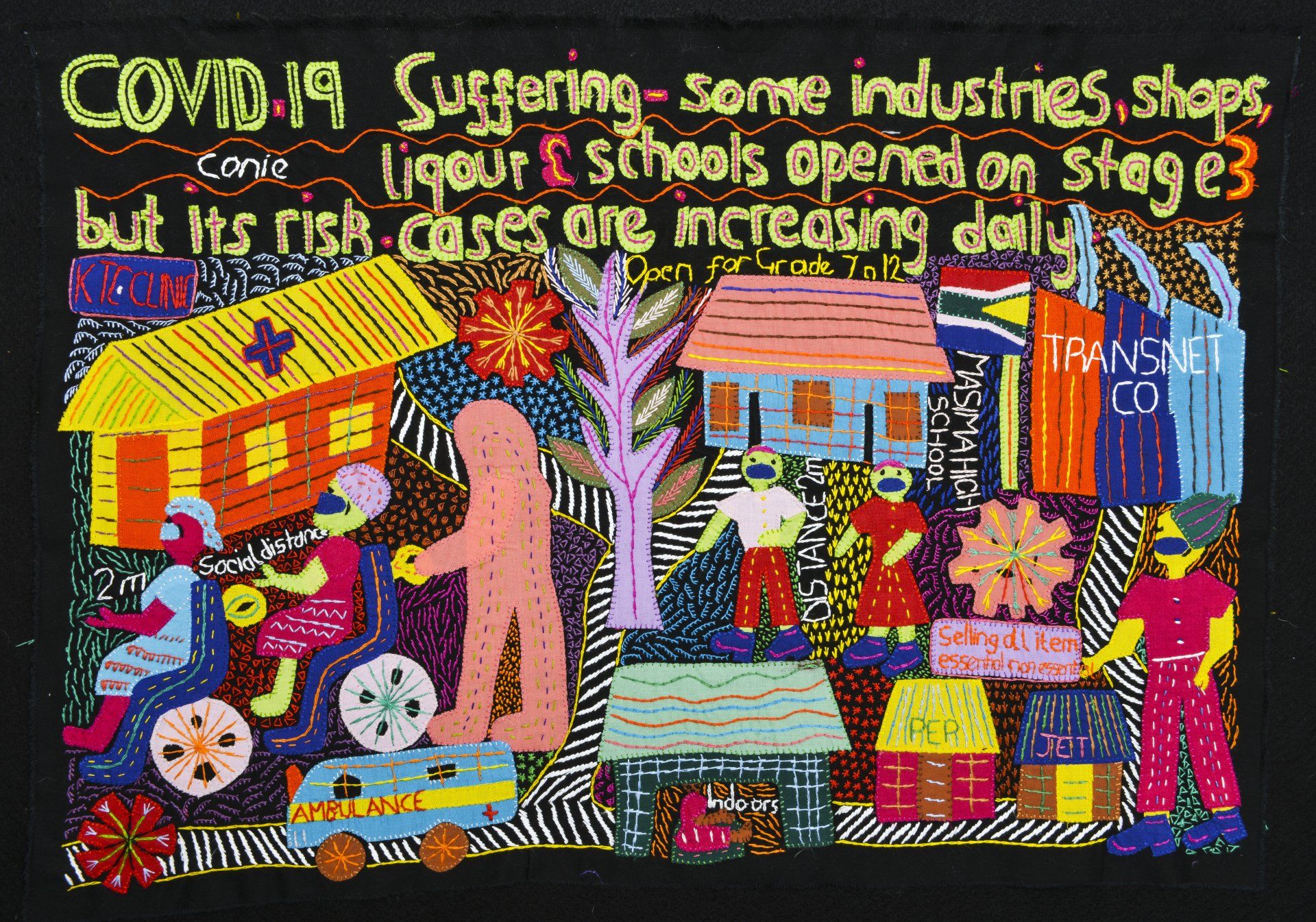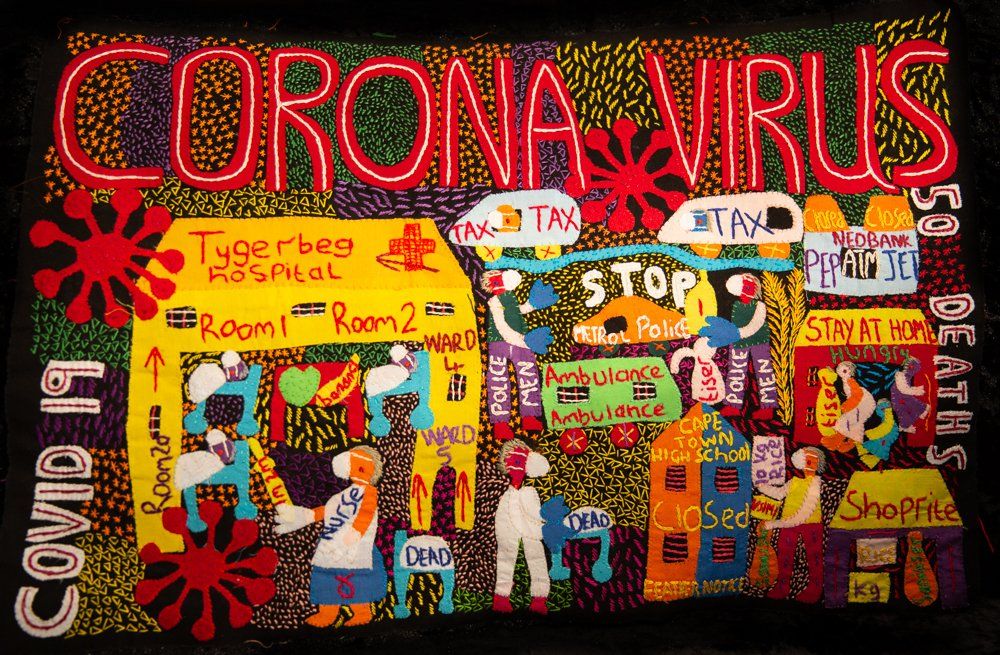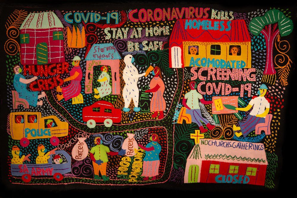When South Africa confronted the depth of the corona virus, women in the Heartworks Stitching Club began documenting their experience through original embroidery depictions of their lives under lockdown. The women artists live in communities that face the greatest risks of infection. Their hand-stitched journals are created as intimate lenses into their lives and collective stories. Together, they form an exhibition that will be featured as an artistic response to this global crisis.